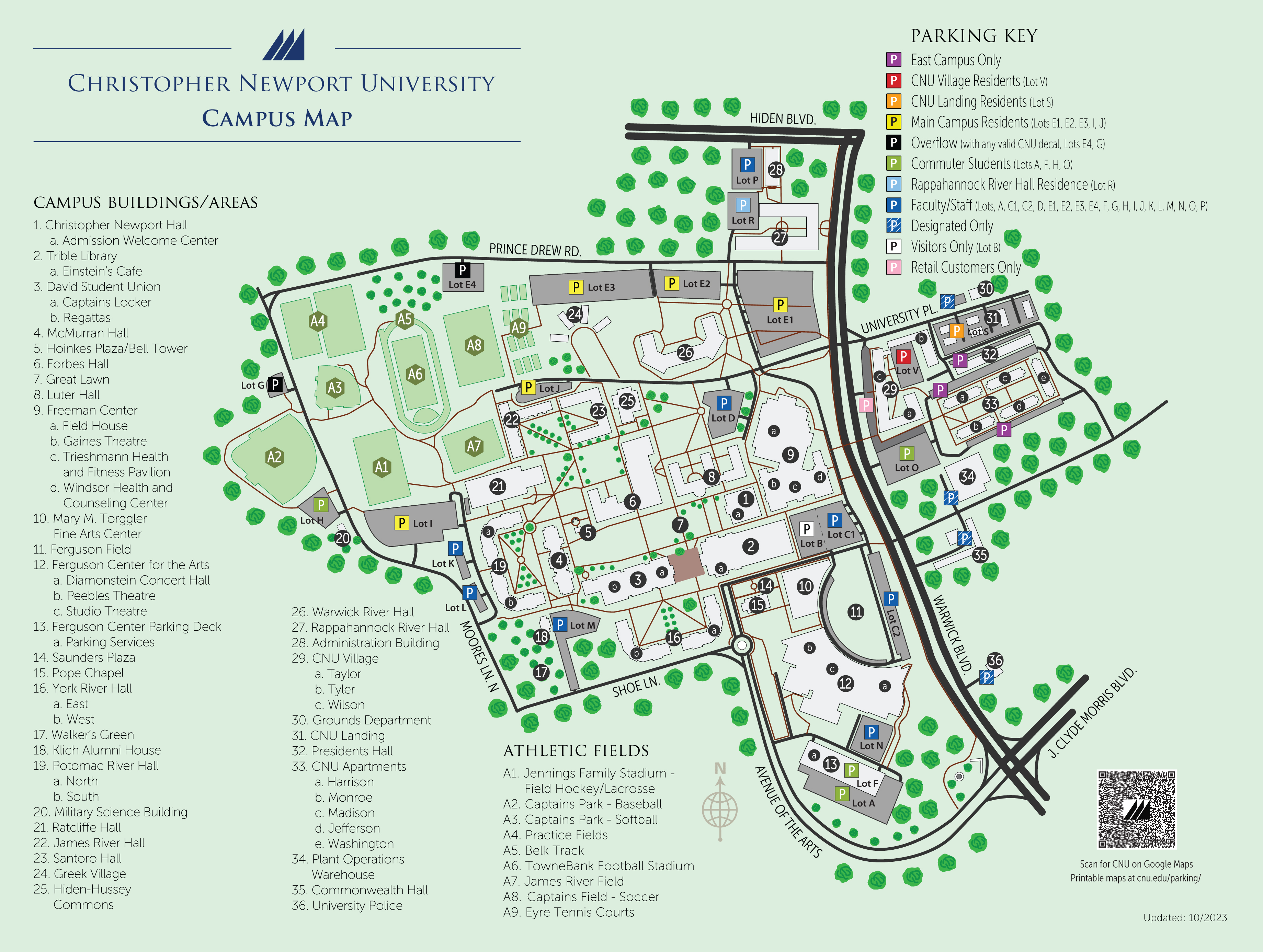 Tomorrow at 8:50am we convene our July CLAS Collaboration meeting at Christopher Newport University. Please find the parking map attached and other relevant information below. We are permitted to park in lot C2, which is right in front of the Torggler Fine Arts Center (Building 10), which is where our meeting will take place. For those who have attended the last two summer meetings, this is the same building and room and similar parking to the last meetings at CNU. If, in the unlikely event that the parking lot is full, there is overflow parking in the parking garage (building 13), which is behind the Ferguson Center for the Arts. Those that have handicap parking or mobility issues can park in the visitor lot (Lot B). Also, as a note, this year we are not required to have the paper parking decals that we had in the past; they have agreed to have open parking in lot C2 and the parking garage during our meeting.