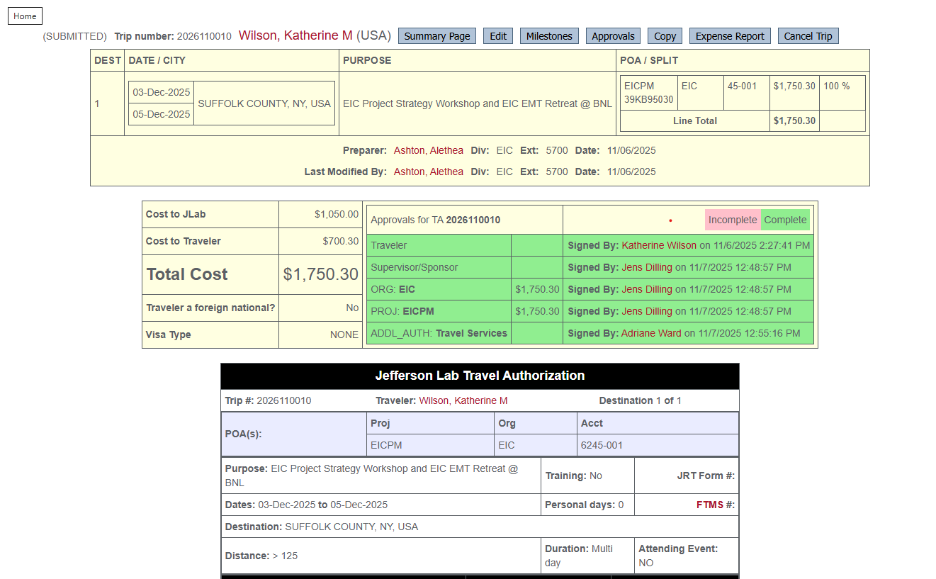 You already have one in the system that I entered on 11/6/2025. It has already been approved. travel: PRINTER<https://mis.jlab.org/mis/apps/travel/printer.cfm?tripnumber=2026110010>