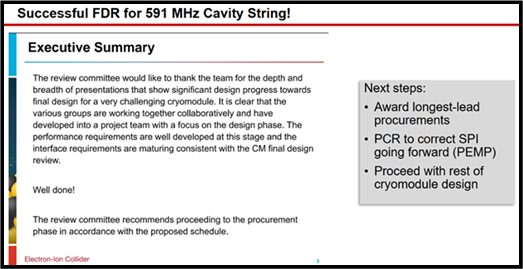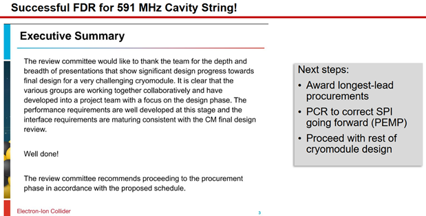 The EIC project has just completed an Independent Project Review, a review organized by the DOE's Office of Project Assessment with external reviewers, to evaluate the project's status and plans with regard to implementing subprojects. Overall, the review went well, and the review committee provided helpful feedback to guide the direction of the project. The reviewers were supportive of the project's plan to split into subprojects, a plan which allows us to optimize technical progress with our currently limited funding. The proposed subproject plan identifies "Accelerator Storage Rings" (the Hadron Storage Ring and Electron Storage Ring, minus the interaction region/detector) as the first subproject, and proposes to baseline this subproject next summer (i.e., designs, schedules, budgets, etc. should be substantially complete). For JLab, this means scope in the ASR — for example, the magnets, cryomodule design, and cryogenics — which are located in the ESR/HSR (but not the IR) are the highest priority for design and development efforts.