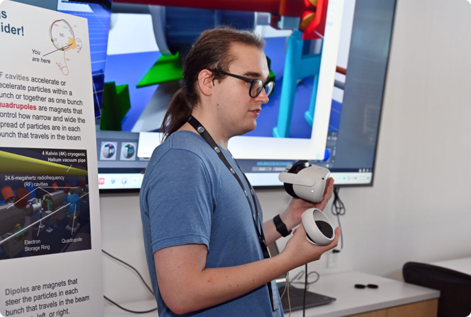 Alex Fahey, an electrical engineer in the EIC Radiofrequency group, designed a virtual reality demo of the EIC's accelerator tunnel. (Kevin Coughlin/Brookhaven National Laboratory)