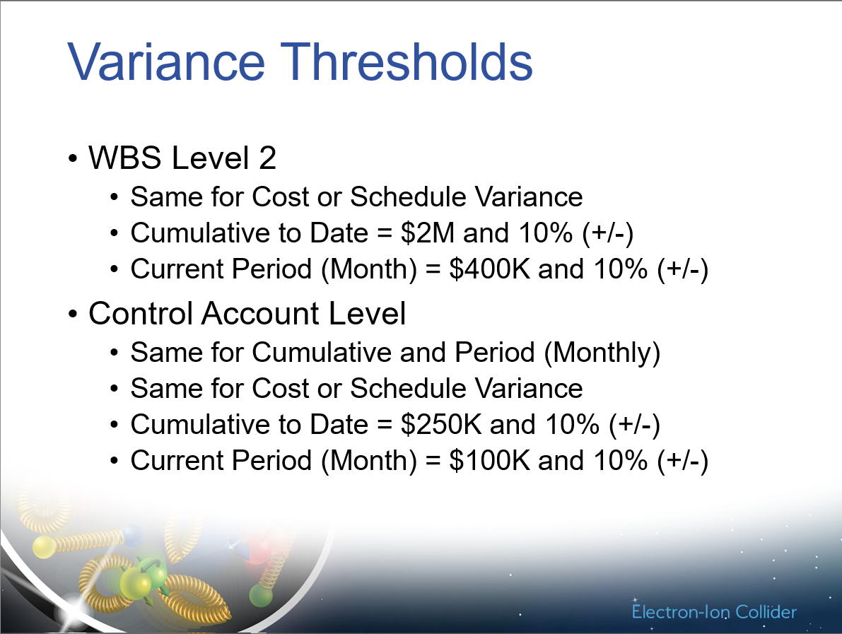 The variances that tripped a threshold will be highlighted in red. The yellow highlights indicate the variances are outside the "green" zone but have not yet tripped the variance threshold. The thresholds are shown below.