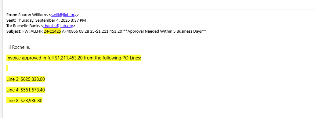 We processed the attached invoice on Sep.5, 2025 based on Sharon Williams approval line 4 of the PO 24-C1425 is vouchered at 77.67 %.