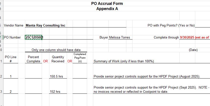 Please complete the Subcontract Percent Complete Form for estimated work completed through September 30, 2025 - this is the date to use on the PO Accrual form as well. It is important that we receive estimated percent complete forms associated with the estimated work performed through this date for which we have a contractual obligation where an invoice has not been received and approved. Accruals are due by Tuesday, September 23, 2025.