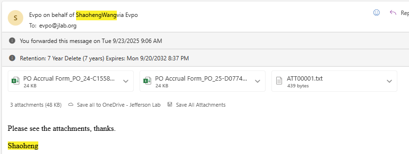 **** Please submit your accrual form to evpo at jlab.org<mailto:evpo at jlab.org> by noon, Thursday, September 25, 2025. If you have nothing to accrue, please email the address provided stating you have nothing to accrue for PO# xxx-xxxxxx.