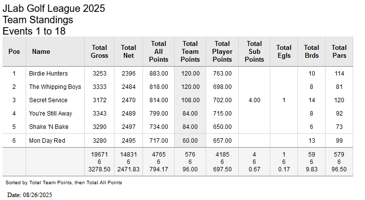 Disregarding the outlier of the Birdie Hunters, the 2nd through 6th place teams in the standings were all within 27 total net strokes of each other. The total net for this group ranged from 2470 strokes to 2497. That's an average for these 5 teams of 2484 and if I break it down a bit further it equates to the average net for each player of 34.5 strokes over the season.
