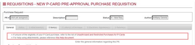 1. You will need to submit a PCard PR for all purchases to obtain approval BEFORE placing your PCard order. Keep in mind, all purchases require 3 quotes. You can attach the 3 quotes to the PR for your AO to review/approve, and these attachments will be automatically attached to your credit card entry once Phase II has been implemented in the next couple of weeks. A credit card entry cannot be created/saved without an approved PR#. There is a link on the PR to review the unauthorized/restricted items list. See screen shot below on where to find this link.