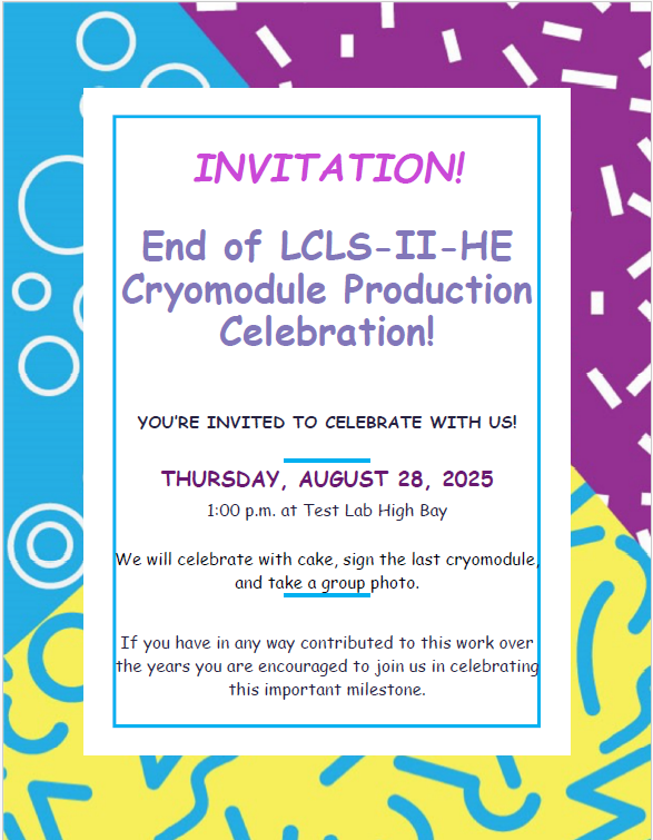 We are planning a celebration to mark the completion of JLab’s LCLS-II-HE cryomodule production scope on August 28th at 1:00 p.m. in the Test Lab High Bay.