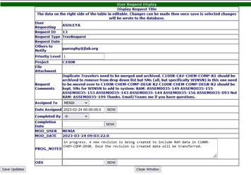 It looks like the first part of the request, to archive C100R-CAV-CHEM-COMP-R1 and to keep C100R-CHEM-COMP-DEGR-R2, was done because C100R-CAV-CHEM-COMP no longer appears as an option in the C100R project. It also appears that the WINSNs have been added and the SNs that were listed as RAM do have the "*" to note that.