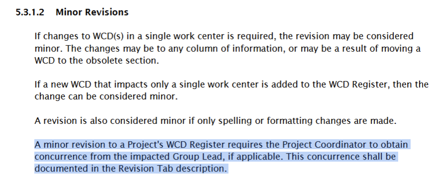 I do not think that is the case. Like the document and records registers, the WCD is owned and maintained by the project coordinator unless it needs to be routed. Please refer to Section 5 of the attached procedure, "The SRF Ops Software Systems Group is responsible for routing the WCD Register for approval, when requested by the Project Coordinator," (my emphasis added). Furthermore, as stated in Section 5.2, "When new versions of the Project WCD Register are approved, the approved file should be uploaded as a new version to the existing Project WCD Register file either by the SRF Ops Software Systems Group for initial or major revisions or by the SRF Ops Project Coordinator for minor revisions." The WCD Register revision is not controlled by Pansophy; only when requested, as the procedure clearly states.