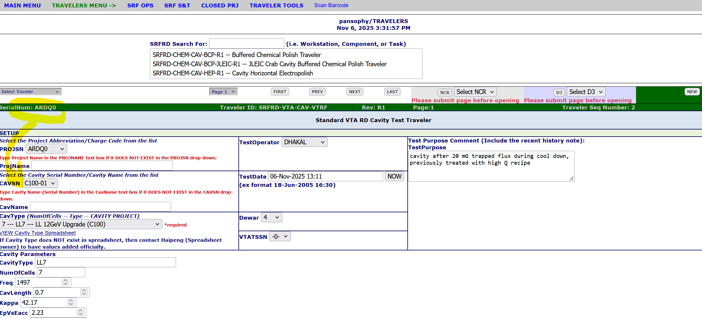 I have corrected our database so that the Select Traveler now contains the Cavity Serial Number rather than the Project.