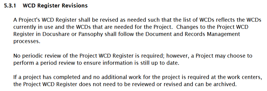 The WCD Procedure is owned by John Buttles in Project Execution. SRF-11-PR-002 Work Control Document Register Procedure R3.pdf<https://jlabdoc.jlab.org/docushare/dsweb/Get/Document-305185/SRF-11-PR-002%20Work%20Control%20Document%20Register%20Procedure%20R3.pdf> In summary, it states that once the initial WCD Register has been created and approved, the SSSG (aka Pansohpy Team) takes over maintenance of the register and follows the Docs & Records process. This change was effective in the document revisions released 17-Sept-2025. The NCR process does not specify a minimum number of dispositioners, but having more than one dispositioner is a best practice to follow so work may continue if someone is not available to disposition a NCR. The dispositioners must be a "JLab SME of the component and/or work center/group, designated to evaluate and assign dispositions on nonconforming products."